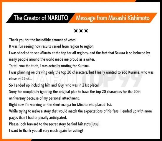 O criador Masashi Kishimoto, desenhará um One-Shot original para o vencedor da votação, Minato Namikaze, o Quarto Hokage ( Minato recebeu 792.257 votos)